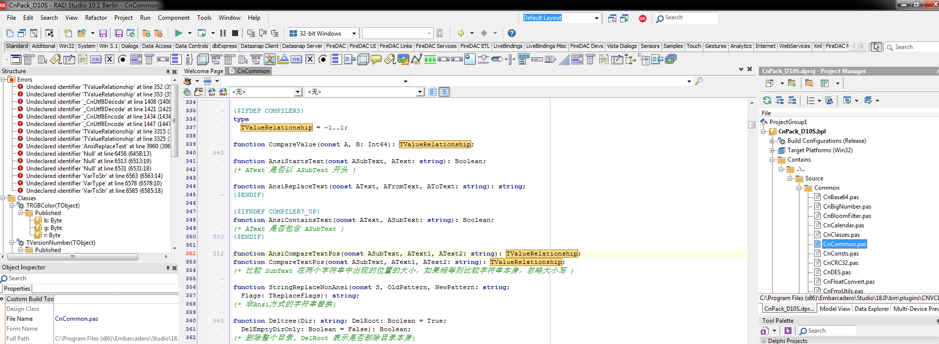 C:\Program Files (x86)\Embarcadero\Studio\18.0\bin\plugins\cnvcl\Source\Common\CnCommon.pas(352,70): error E2003: E2003 Undeclared identifier: 'TValueRelationship'