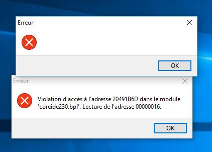 The first error apear after CNPack is shown on Delphi Splash screen, then it follow the second blanc dialog, when clicking Ok, the second box is closed, and when it try to close de first dialogbox, it reapear.