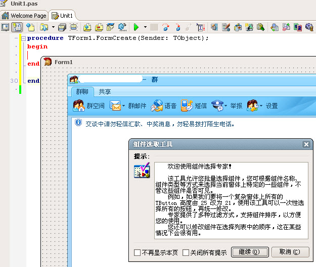 这里他将一个QQ群窗口(或其他打开的窗口)提前了,在提示与欢迎窗口 与 Form1之间