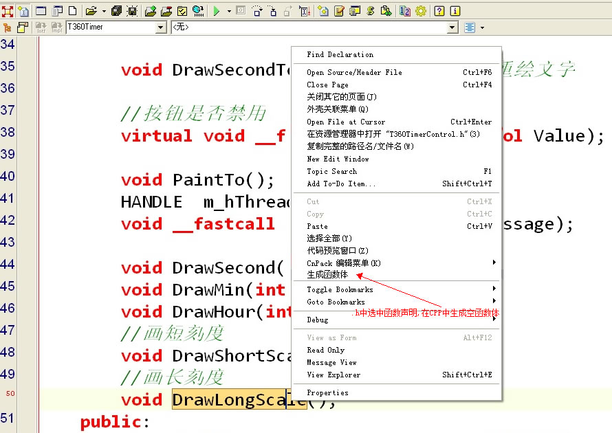 希望在.h文件中,写好了函数声明后,光标停在此行,然后右键菜单中,增加在.cpp文件中,生成函数体(空的)的功能