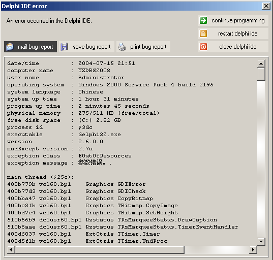 你上面的错误信息显示,是一个 TRzMarqueeStatus 在 Draw 的时候报资源不足的错。