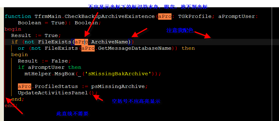 2. 对于“光标下匹配标识符和关键字"的高亮显示,我觉得应该只高亮显示其它匹配的配标识符和关键字, 而不应该高亮当前光标下的配标识符和关键本身,否则眼花,找不着当前光标的位置了。