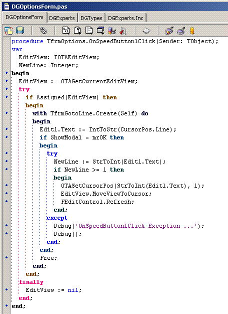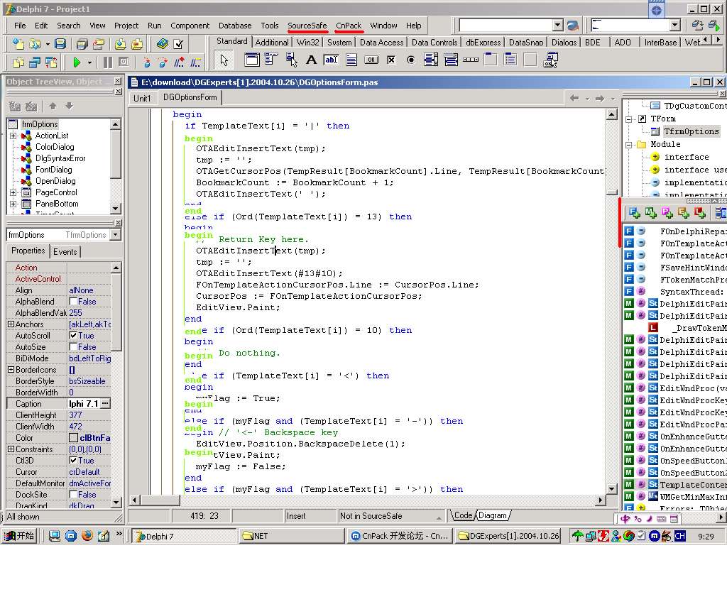 CodeRush for Delphi可能停止开发了,则不是我说的,是Erik Berry(GExperts作者)在Borland新闻组说得(我在opentools新闻组问问题的时候他回答的时间说得 Thread:2004-07-05),Castalia 不稳定且功能较弱,所以我就写了这个Experts,板猪看看有没有参考价值吧。