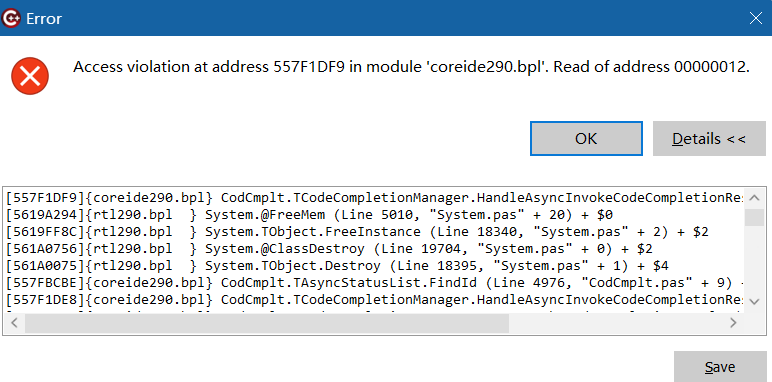 [557F1DF9]{coreide290.bpl} CodCmplt.TCodeCompletionManager.HandleAsyncInvokeCodeCompletionResult (Line 1345, "CodCmplt.pas" + 8) + $0