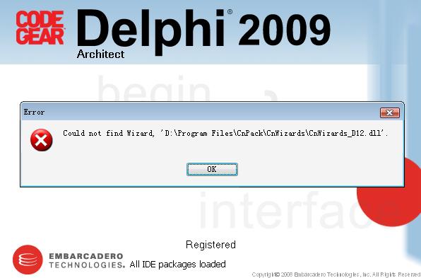 各位老师好,学生下载安装了cnwizards后,再打开delphi2009出现如图所示情况,请老师赐教。