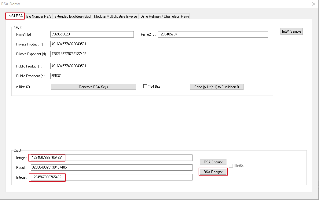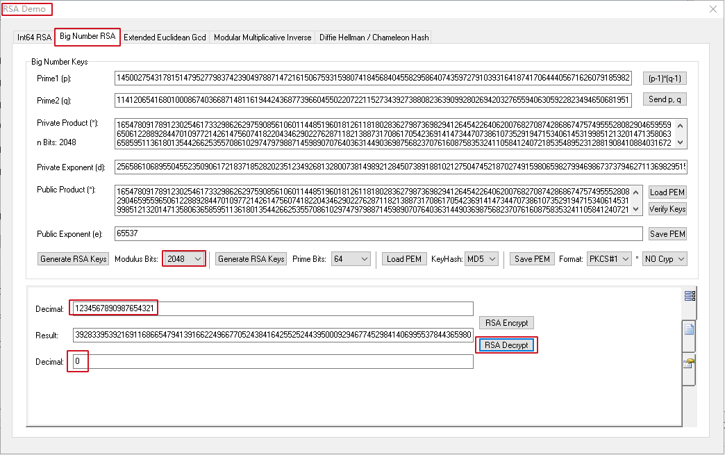 2、Big Number RSA,参数全部默认,解决结果为:0,接着,调一下"Modulus Bits" 2024,也一样(因为我要用到2048);<br />