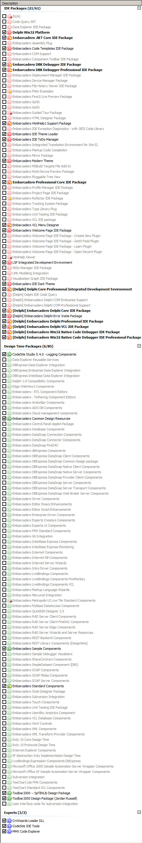 Maybe this screenshot will give some hint. The fact is that I have disabled all the packages that I don't need (in particular, all DB Aware things are disabled, all platforms except Win32 and all unne ...