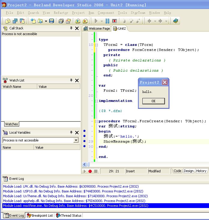 CnWizards 的源码中有一个函数 Hook 单元 CnWizMethodHook.pas,下面这个例子替换掉了最基本的 IsValidIdent 函数,你可以把它放到包里面安装一下,就可以在 IDE 的设计器中使用中文组件名,不过代码编辑器还是会报错。根据这个方法,中文支持理论上是可行的,就是要花水磨功夫一处一处去修改。CnWizards 目前还不考虑开发这个功能,如果谁有兴趣,可以做为一个单独的子项目开发。