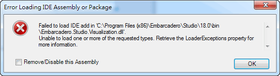 | Subject: Failed to load IDE add in \bin\Embarcadero.Studio.Visualization.dll |