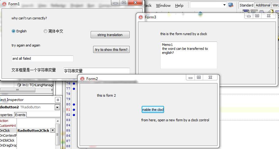 1) 打开第一个窗体,切换到英语状态,通过按钮启动第二个窗体,再在第二个窗体上用激活时钟控件,启动第三个窗体。这时,只有第一个窗体是英语界面,第二、三个都是中文界面(图片1)。